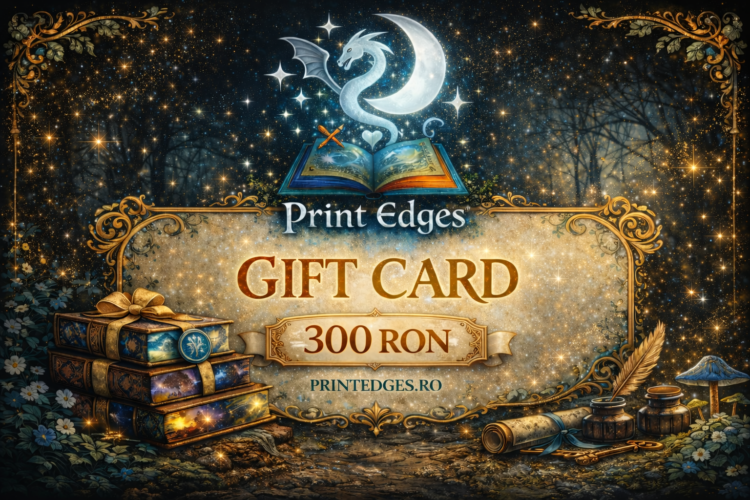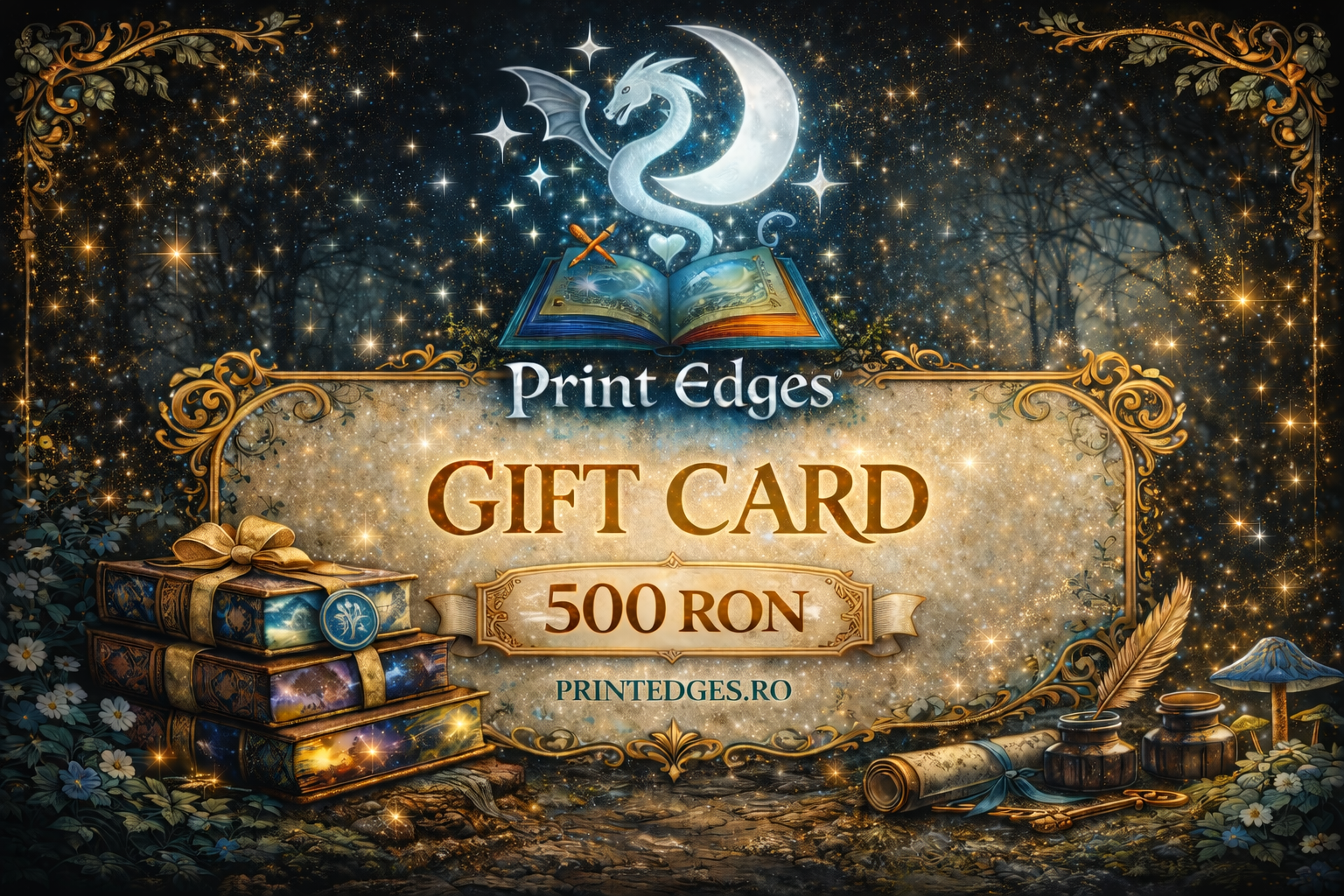 Gift card-ul Print Edges este cadoul perfect pentru iubitorii de cărți și de ediții speciale. Destinatarul își poate alege singur cartea preferată și o poate transforma într-un obiect unic, cu margini personalizate artistic (printed edges) – exact pe gustul lui.
